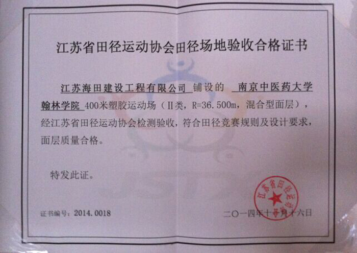 我公司承建的翰林學(xué)院400塑膠運動(dòng)場(chǎng)被評為“江蘇省合格田徑場(chǎng)地(Ⅱ)”